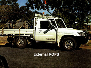The common two types of ROPS are internal or external structures. Internal ROPS (as produced by Brown Davis) are designed to fit inside the cabin space of the vehicle mounting to its floor pan. On the other hand, the external types are designed to fit around the outside of the vehicle cabin mounting to the chassis rails under the vehicle, or behind the cabin as part of the rear tray sometimes extending over the cabin roof. |