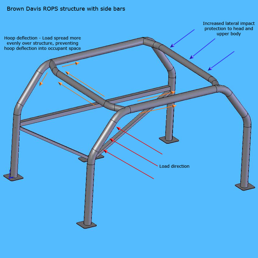 The particular area of design in a 4-point dual cab or wagon style ROPS that can have critical safety benefits, is the placement or structural location of the roof side bars connectin the two structural hoops. Brown Davis has produced and tested countless prototype ROPS designs, whilst constantly adjusting the location of structural components in order to obtain the strongest possible structure. This constant improvement has also lead to offering additional roof deformation protection in point load side impacts. As a result, Brown Davis have proven that having the side bars being located close to the door entries/roof edge, creates a stronger ROPS structure, and retains more than adequate head space for occupants. Locating the side bars in this position greatly enhances the fore/aft strength characteristics of the structure when load is placed on the corner of a hoop in a fore/aft direction. Not only is the structure a lot stronger, having the side bars in this position also prevents penetrating cabin deformation of the side roof rails between the structural ROPS hoops, which would otherwise be unprotected, and leaving an occupant vulnerable to potentially fatal injuries.