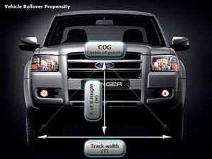 A vehicles rollover propensity or 'the tendency of a vehicle to roll', can be calculated through a simple mathematical formula of T/2H (where 'H' = height of the Centre of Gravity of the vehicle; and 'T' = vehicle track width). Put simply, the higher the vehicle's centre of gravity, and the narrower the track width, the greater the chance of a rollover accident occurring.